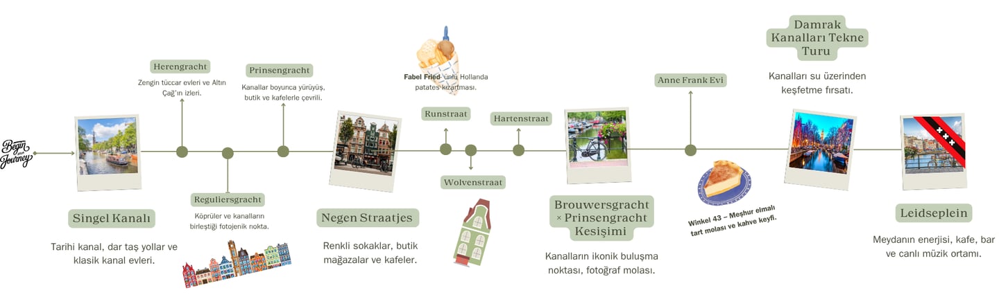 · Singel Kanalı · Herengracht, Reguliersgracht, Prinsengracht · Negen Straatjes (Runstraat, Wolvenstraat, Hartenstraat) · Anne Frank Evi · Damrak Kanalları Tekne Turu · Leidseplein