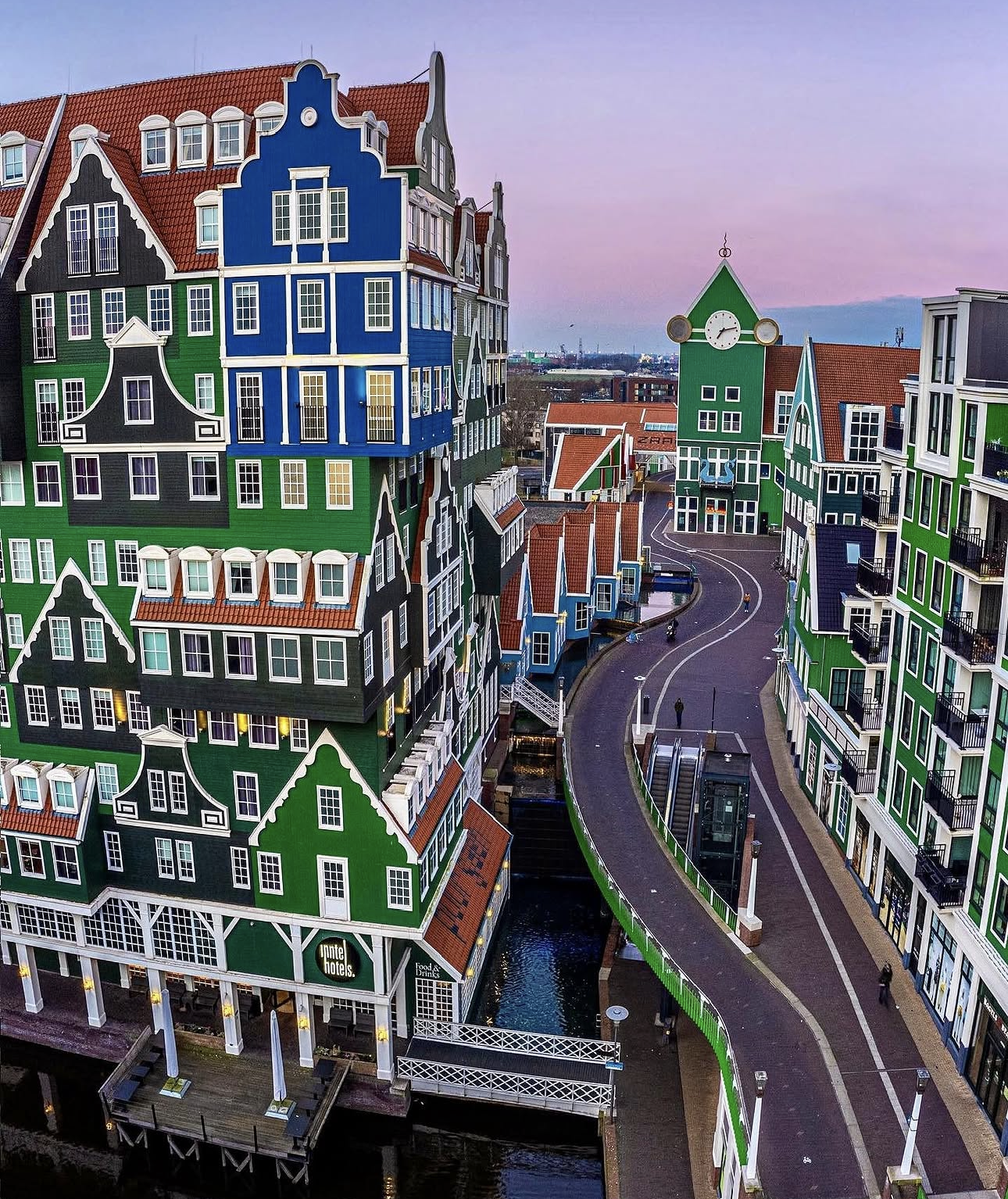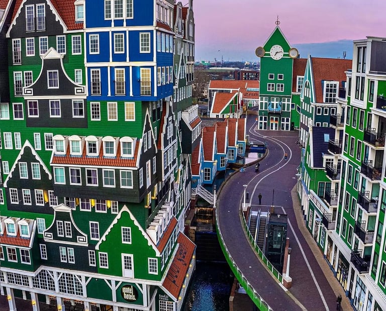 Zaandam’a adımını attığında, ilk fark edeceğin şey mimarinin adeta bir masal kitabından fırlamış olması. İstasyonun hemen yanında yükselen Inntel Hotel Zaandam, yeşilin ve mavinin tonlarına boyanmış, üst üste dizilmiş ev görünümlü cephesiyle şehrin simgesi haline gelmiş. Yerel halkın “Lego evler” olarak andığı bu yapı, geleneksel Zaan bölgesi mimarisini modern bir dille birleştiriyor.