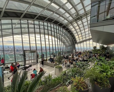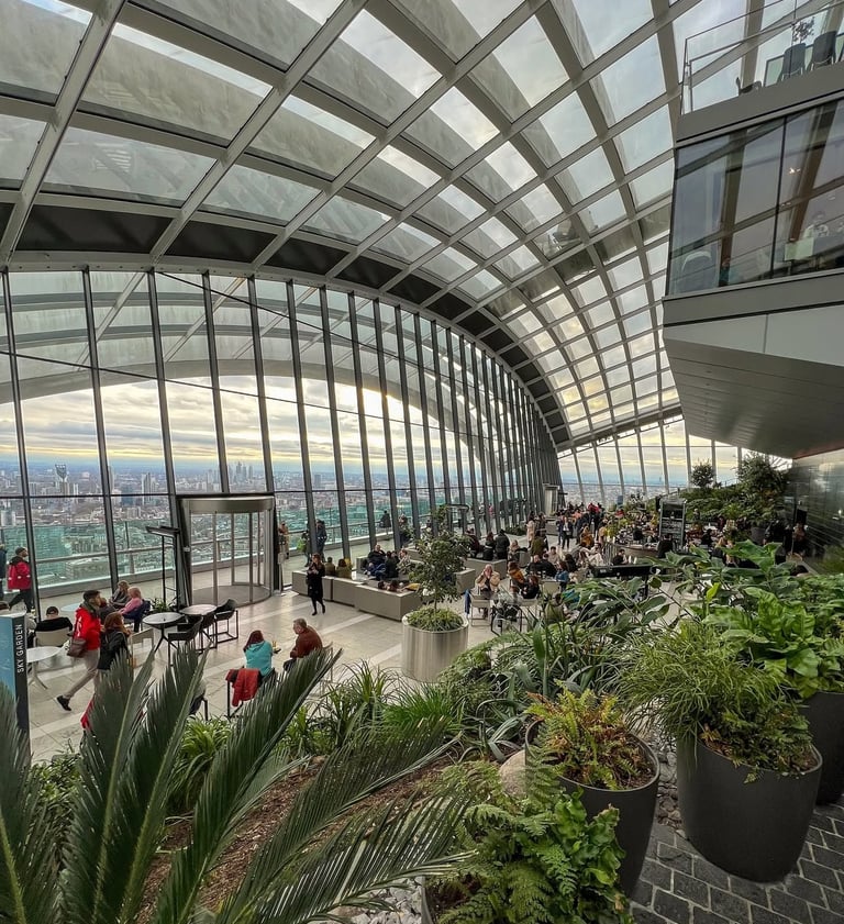 Londra’nın göbeğinde gökyüzüne yükselen Sky Garden, dev cam kubbesi altında tropik bitkilerle çevrili bir şehir bahçesi gibi. Ücretsiz olarak çıkabileceğin bu gözlem alanında 360 derece manzara seni karşılar; Thames’in kıvrımları, Tower Bridge ve St. Paul’s ayaklarının altına serilir. İstersen manzaraya karşı Sky Pod Bar’da bir kahve ya da kokteyl eşliğinde soluklanabilir, günün en keyifli molalarından birini verebilirsin.